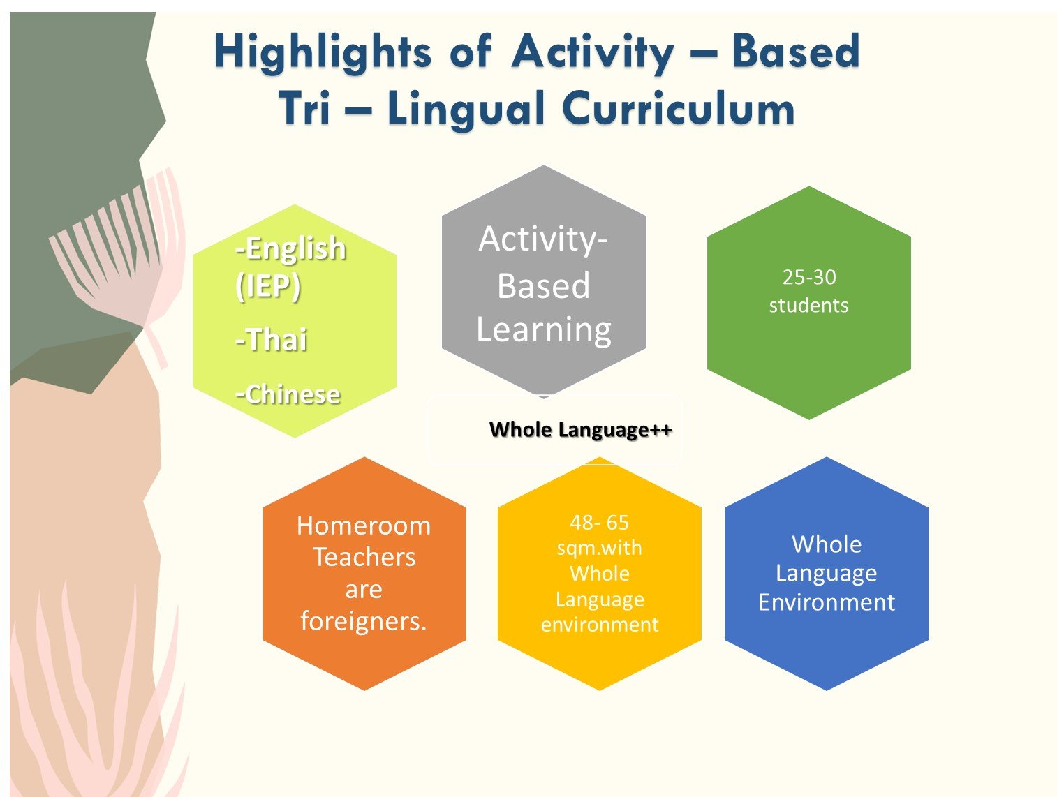การสอนภาษาแบบธรรมชาติ (Whole Language Approach) คือ การที่เด็กได้เรียนรู้การใช้ภาษาทั้งด้านการฟัง พูด อ่าน เขียนไปตามธรรมชาติ อย่างมีความหมายสำหรับเด็ก สอดคล้องเหมาะสมกับวัย จะเน้นให้เด็กได้ลงมือทำด้วยตนเอง เช่น อ่านนิทาน เล่าเรื่องราว ฟังนิทานที่ครูหรือเพื่อนเล่า เขียนคำที่ตนสนใจจากเรื่องที่ได้อ่านหรือได้ฟัง โรงเรียนอนุบาลอำไพมีความเชื่อว่าการจัดหลักสูตรที่เหมาะกับพัฒนาการของเด็ก ทั้ง 4 ด้านไม่จำเป็นต้องมีตำราตายตัว ครูสามารถใช้สื่อรอบตัวรวมถึง สื่อ อิเล็กทรอนิกส์ ที่เด็กๆสามารถพบเห็นได้จากชีวิตประจำวัน จึงมีความหมายสำหรับเด็ก เรียนตามหลักสูตรสถานศึกษาโดยใช้นวัตกรรมที่เน้นผู้เรียนเป็นสำคัญ เป็นActivity- Based